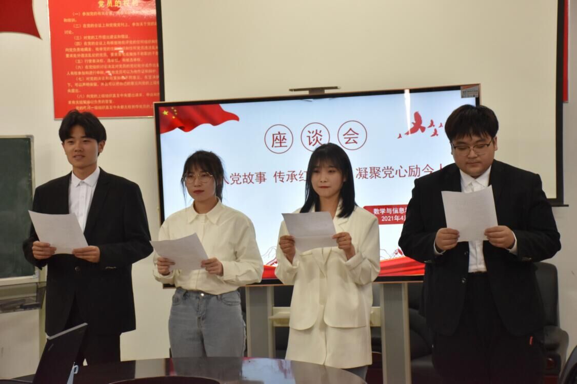 座谈会上,马国光老师从党史出发,回顾了中国共产党的百年历程。同时结合自身事例,满怀深情地回忆了自身以实际行动积极要求入党的经历,畅谈入党初心,表明将永葆共产党人的革命本色,做到退休不褪色、离岗不离党,为学校建设再作新贡献。肖欣老师结合自身经历(从插队知青时加入党组织,到考大学,再到成为教师),从感恩、做好每个阶段的自己及珍惜每一个经历这三个主题出发,分享了自己教师生涯的经验和体会,教育入党积极分子入党后要更加积极进取,保持入党初心,带领身边的普通同学共同进步,做一名合格党员。