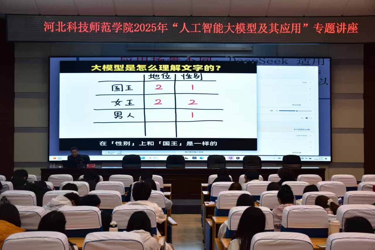 活动启幕后,网络中心主任齐玉斌教授以《人工智能大模型及其应用》为题,带来首场专题讲座。讲座中,齐教授以 Deepseek 为核心典型案例,通过现场直观演示,将大模型在数据分析、文本生成等实际场景中的应用技巧全方位展现给在场师生;此外,他还巧妙联动其他AI工具,生动展示跨平台协作方案,讲解深入浅出、通俗易懂,赢得了师生的阵阵掌声。