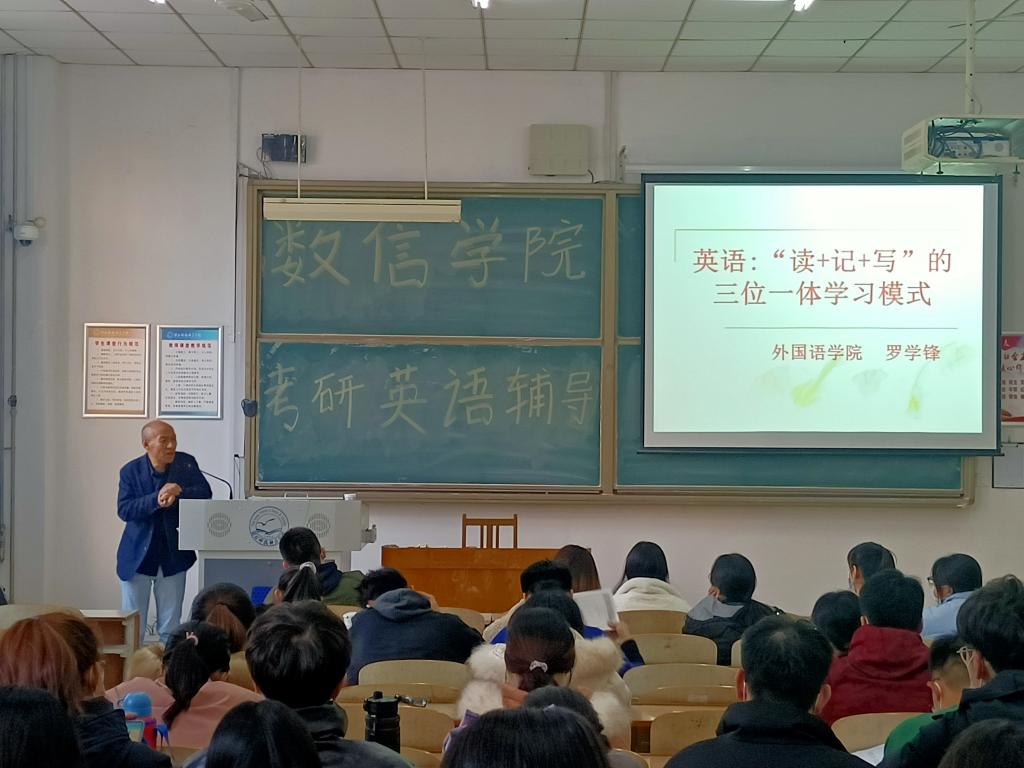 2021年11月13日下午,开云官网在逸夫楼A109举办了一场“攻克英语,助力考研”英语公益讲座,讲座邀请了开云官网外国语学院副院长罗学锋教授主讲,开云官网70多名即将考研的学生聆听了讲座。