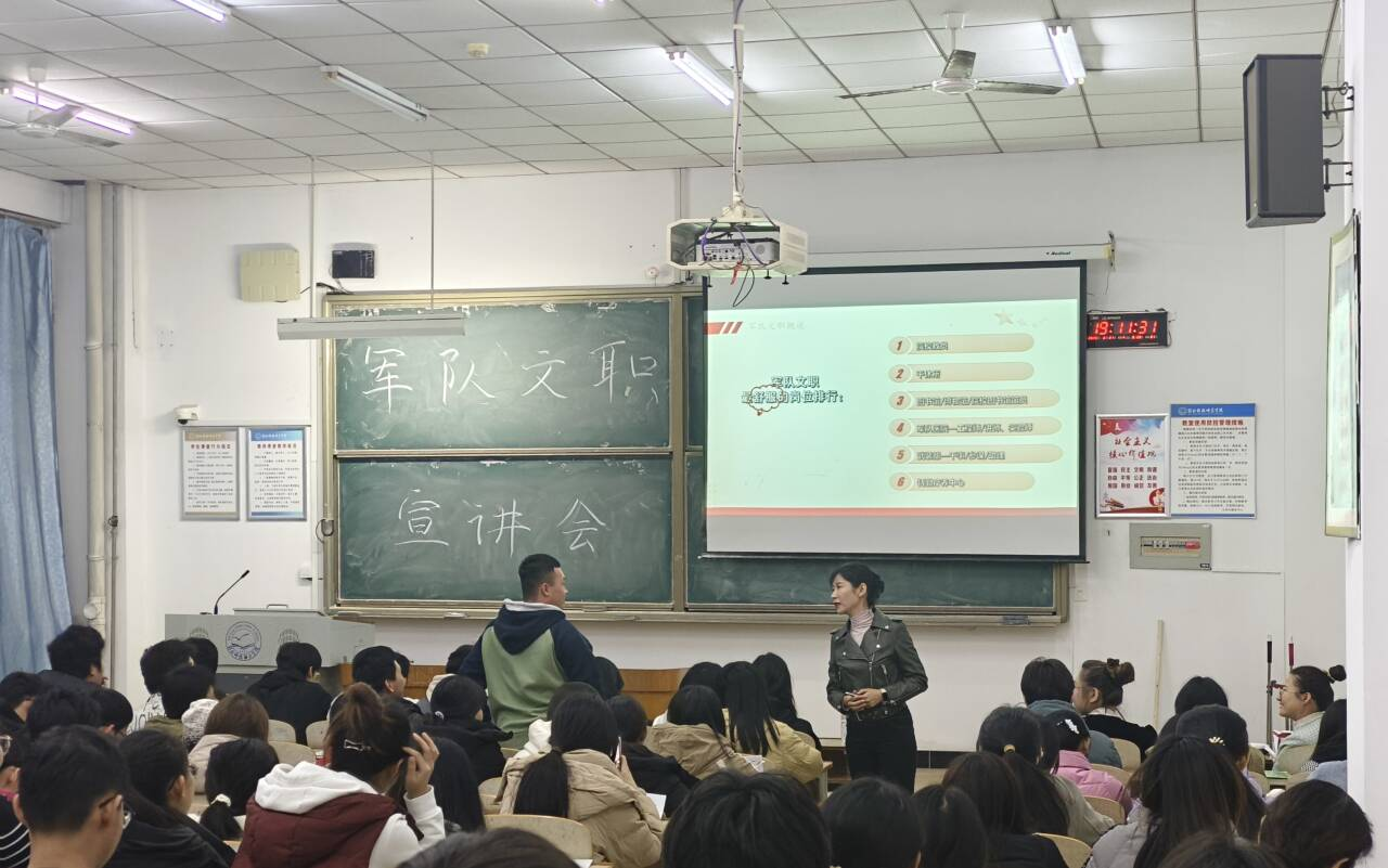 为了让同学们对军队文职人员岗位有更加深入的了解和体会,2024年11月21日开云官网邀请了专家在逸夫楼A103开展军队文职宣讲会。