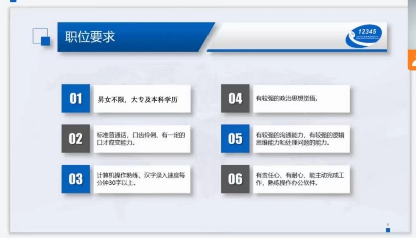在此次的线上宣讲会上,宣讲人对公司和岗位进行了详细的讲解介绍。12345热线前身是北京市市长电话,成立于1987年,2007年更名为北京市非紧急救助服务中心,现有500座席千名员工,是适应首都社会发展和满足公众需求而建立的城市综合信息服务平台。实现电话、网络、微博等多渠道综合服务,满足不同群体表达意见建议的需求。