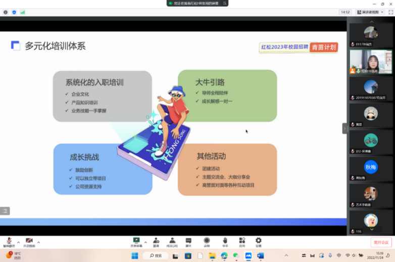 2022年11月24日星期四下午3点红松空中宣讲会顺利在线上召开。kaiyun开云官方有求职意愿的同学积极参加了本次会议。