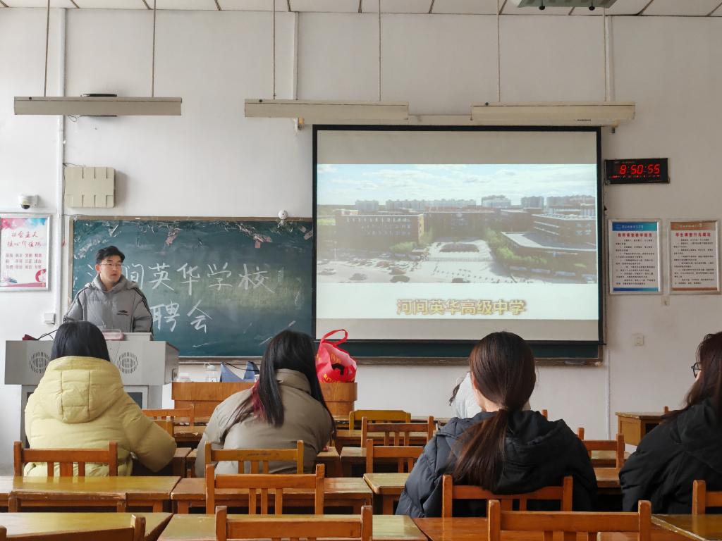 本次招聘会的主讲人袁老师给同学们详细介绍了该学校的情况。河间英华学校是一所高起点、高规格、高品质的现代化学校。此校快速发展,颇受社会各界关注,且其薪资待遇优厚。学校提供教师公寓、老师备课区,文化建设高端大气。学校有教职工食堂,每天都有专职师傅搭配饭菜,营养合理,搭配均衡,半价供应。