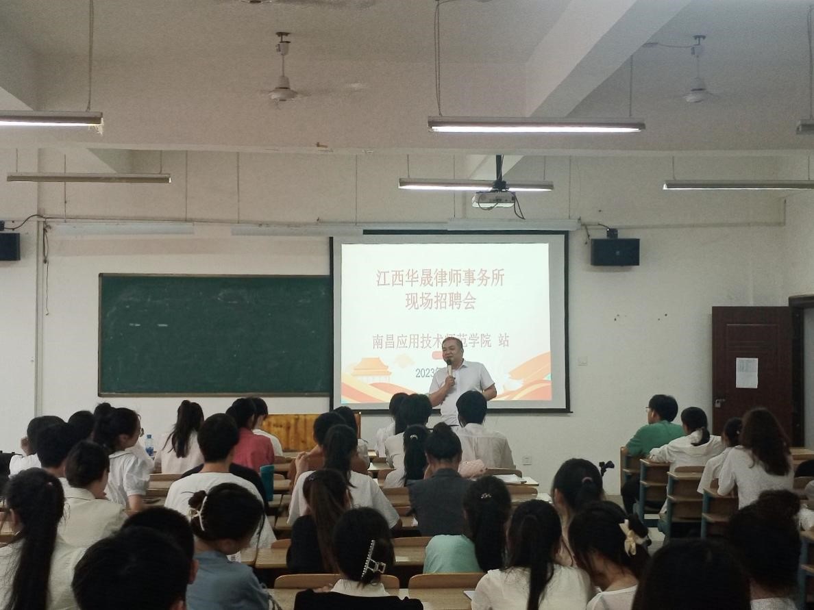 为促进今年会毕业生更好就业,2023年5月17日上午10点,学院在教学楼3307教室,组织了法学专业毕业生专场招聘会,招聘方为江西华晟律师事务所。