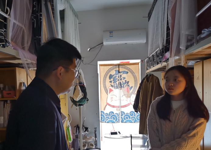 每走进一个寝室,张欣康都和同学们就学习生活工作等方面进行交流,并详细了解他们的未来规划及就业去向,询问毕业生当前遇到的困难和问题,并表示学院会尽最大努力地帮助同学们解决。张欣康期望即将就业的同学们在新的岗位上积极进取,踏实工作,争取更大的成绩;并寄语升学的同学们希望他们在未来学习的道路上奋力拼搏,早日为国家建设贡献力量;同时向暂未就业的同学传达“先就业后择业”的就业观念,提醒同学们要把握春季招聘的黄金阶段,明确自身优势、找准就业目标、勇于尝试挑战,尽快锁定心仪的工作岗位。