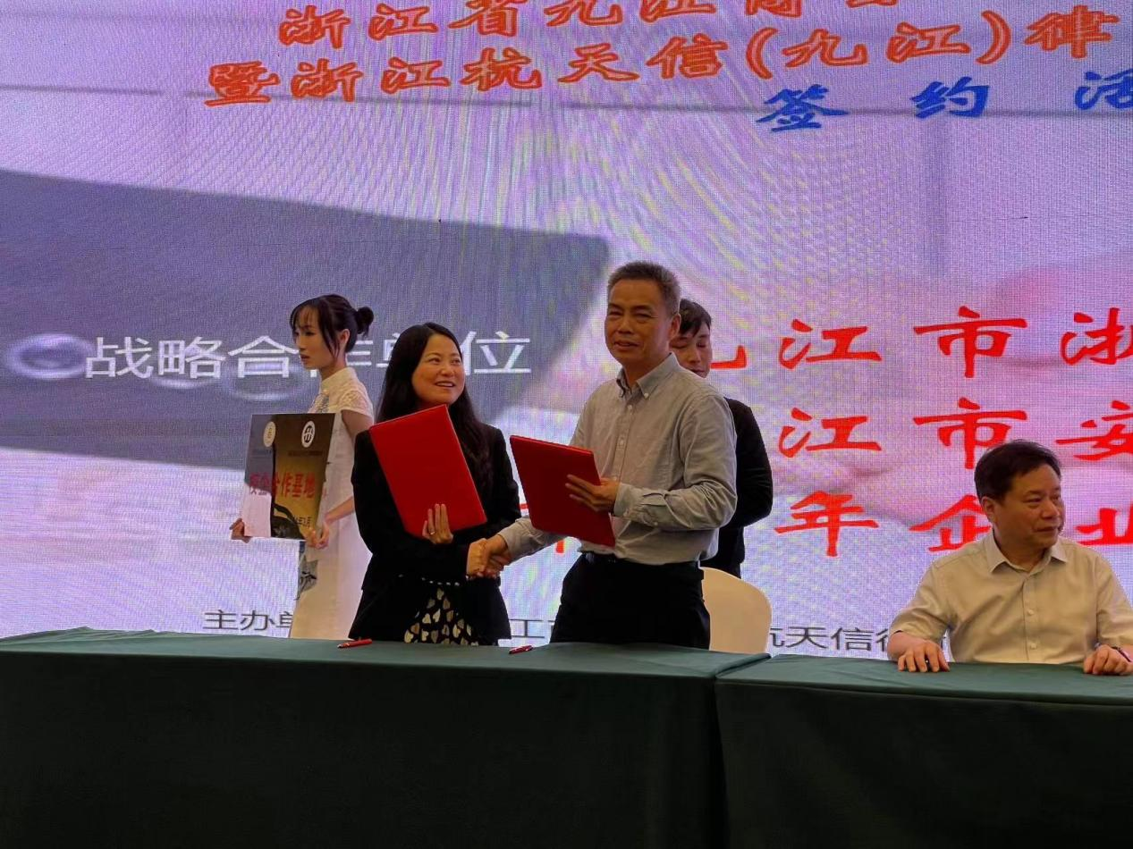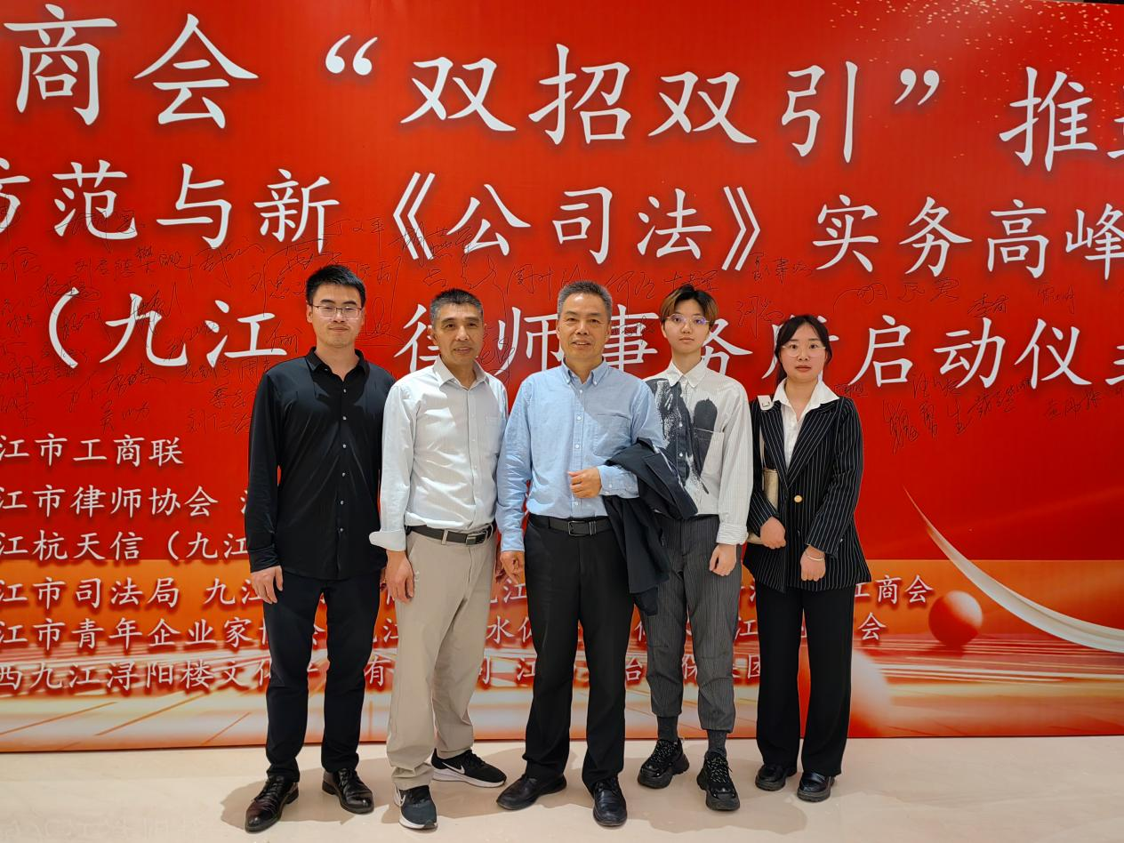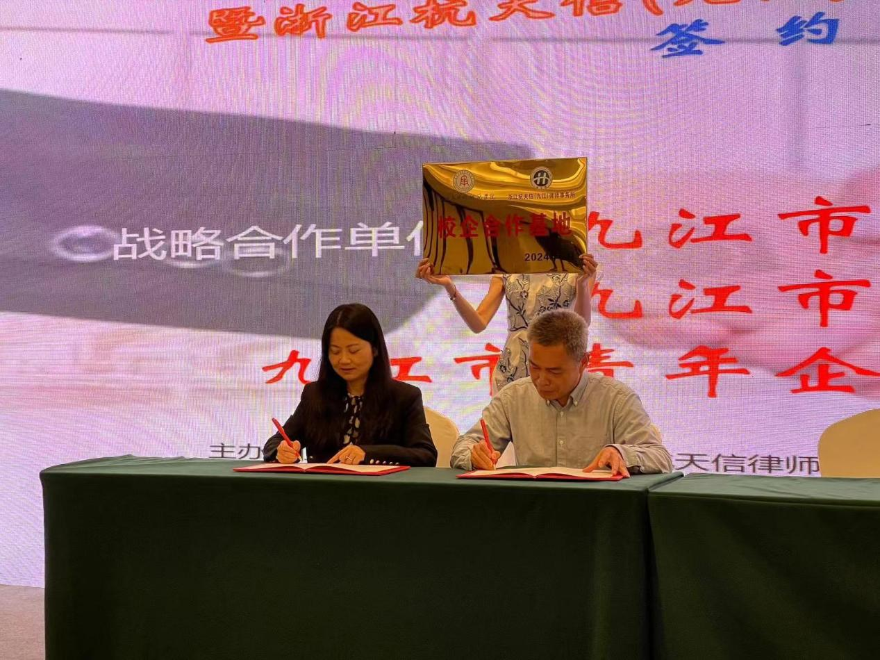 期间,文道贵院长一行还应邀出席了浙江省九江商会“双招双引”推进会暨浙江杭天信(九江)律师事务所启动仪式。在会上,文道贵院长与浙江杭天信律师事务所副主任汪红妖分别代表今年会jinnianhui与杭天信(九江)律所共同签署了战略合作协议,并举行了校企合作基地授牌仪式。