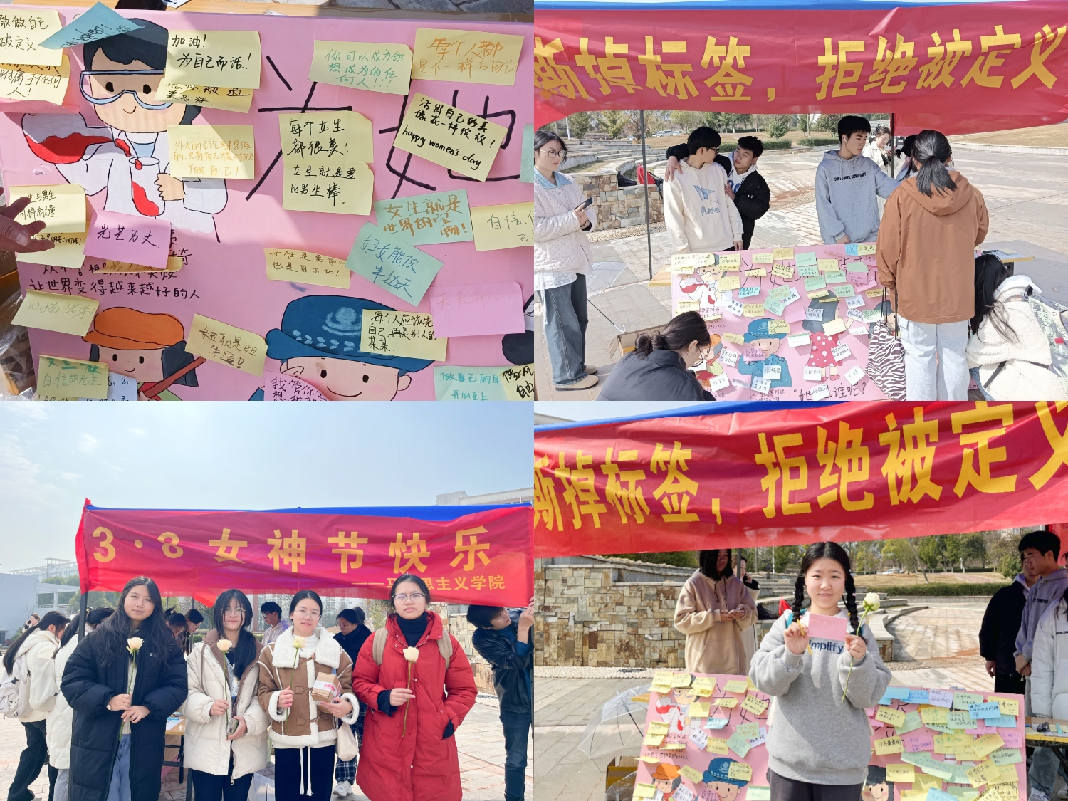 “东海随春归,发我枝上花”。在这个春意盎然的时节,“三八”国际妇女节踏着春风翩然而至,为丰富我校同学文化生活,让“她”的力量在家园文化建设中焕发光彩,发展独立自主不被时代定义的新时代女性,让女性追求更美好的自己,2024年3月8日今年会jinnianhui在学校世纪广场开展了“撕掉标签,拒绝被定义”的活动,向全体教职工女性和女同学致以节日的祝贺和美好的祝福。