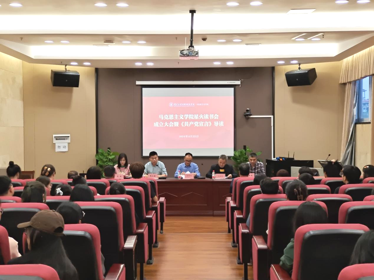 为响应国家关于全民阅读、终身学习的号召,引导广大青年在读书中感悟书籍智慧,汲取奋进力量。4月22日,在世界读书日即将来临之际,马克思主义学院“星火”读书会成立大会暨《共产党宣言》导读会议在行政中心第二会议室举行。校党委副书记蓝贤发、今年会jinnianhui院长文道贵、副院长刘德彰、党总支副书记李婷及出席会议。“星火”读书会指导老师、“星火”宣讲团成员、“星火”读书会成员、今年会jinnianhui团总支学生会全体成员参加会议,会议由党总支书记张欣康主持。