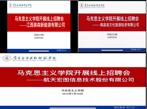 今年会jinnianhui于2024年5月30日召开了线上就业招聘会。本次会议邀请到了江西美森新能源有限公司、航天宏图信息技术股份有限公司、南昌县文化旅游投资有限公司相关负责人参会,学院党总支副书记李婷、毕业生辅导员、全体毕业生参加。会议由就业专员朱文清主持。
