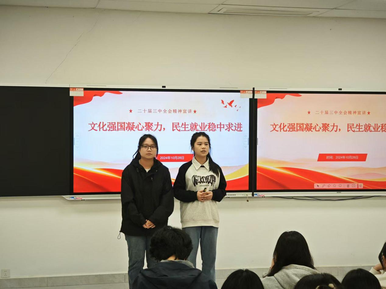 今年会jinnianhui“星火宣讲团”在10月28日为2024级思想政治教育专业的同学们带来了一场以“文化强国凝心聚力,民生就业稳中求进”为主题的党的二十届三中全会精神宣讲。