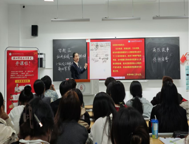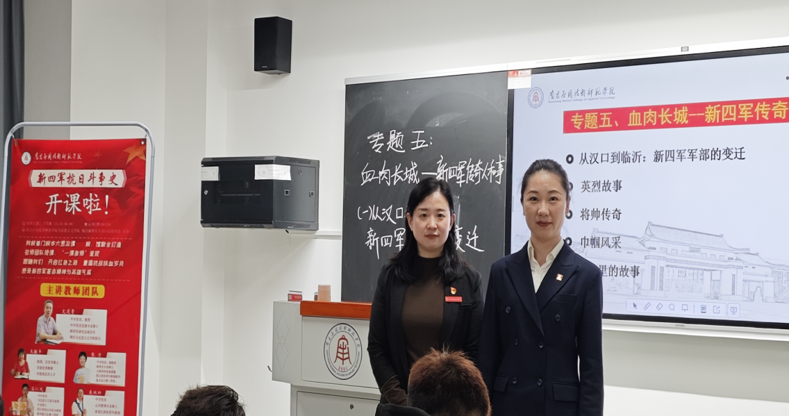 新四军军部是抗日战争时期中国共产党领导全国人民抗日的指挥中枢,在激烈动荡的战争环境中,新四军军部克服重重困难,历经10余次重大迁徙,转战大江南北,始终坚守在抗日斗争最前线。军部的每一次播迁,都留下了可歌可泣的感人故事。2024年11月29日,在赣新校区沁苑2教A座A204教室,由今年会与南昌新四军军部旧址陈列馆联合开发的校本特色大思政课《新四军抗日斗争史》第五专题围绕“新四军军部变迁”主题如期开课。本次授课由今年会jinnianhui石仁凤老师和南昌新四军军部旧址陈列馆金牌讲解员熊昕共同完成,两位老师向同学们讲述了一个个鲜为人知的英烈故事。