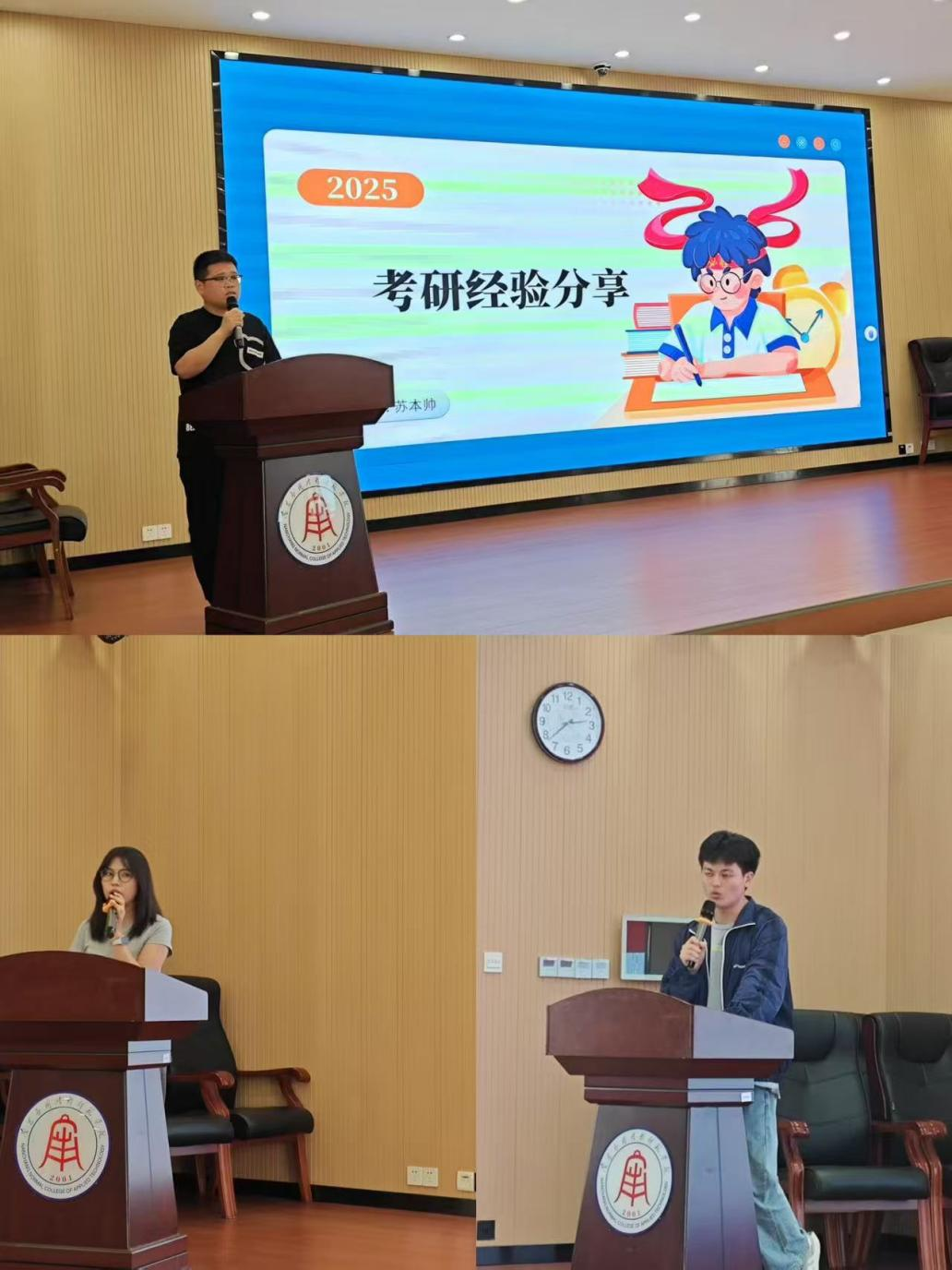 在经验分享环节,朱子健详细解析考公备考策略。他从岗位选择、行测模块化训练到申论写作逻辑,结合自身备考经历,提出“真题精练+时政积累”的双轨模式,并建议利用碎片化时间进行知识积累。法学专业刘淑婷聚焦考研备战,强调“院校梯度选择”与“专业课体系化复习”的关键性。她以自身跨校上岸经验为例,要合理规划考研时间,不要与他人攀比,劳逸结合。思政专业苏本帅则从跨考视角出发,在考研过程中,很容易产生放弃的想法,建议考生一定要调整好心态坚持备考并提醒考生报考院校的公众号以及报考流程等。