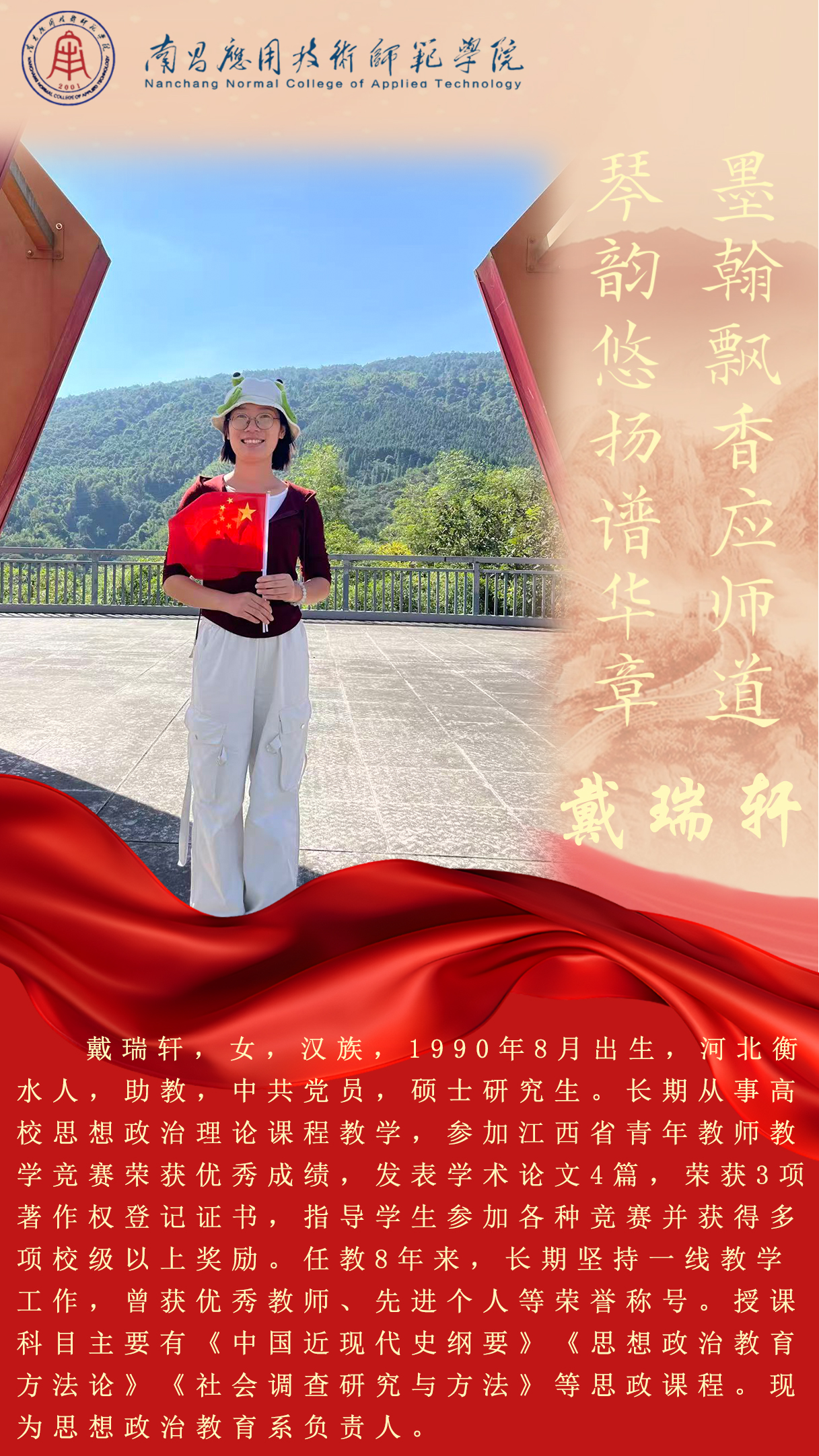 先进典型 优秀毕业生 优秀在校生 优秀教职工 您现在的位置是:首页 > 先进典型 > 优秀教职工 戴瑞轩 思想政治教育系主任 管理员2025-06-091943 上一篇 龚三妹 法学系主任 下一篇 邹颖 最美辅导员