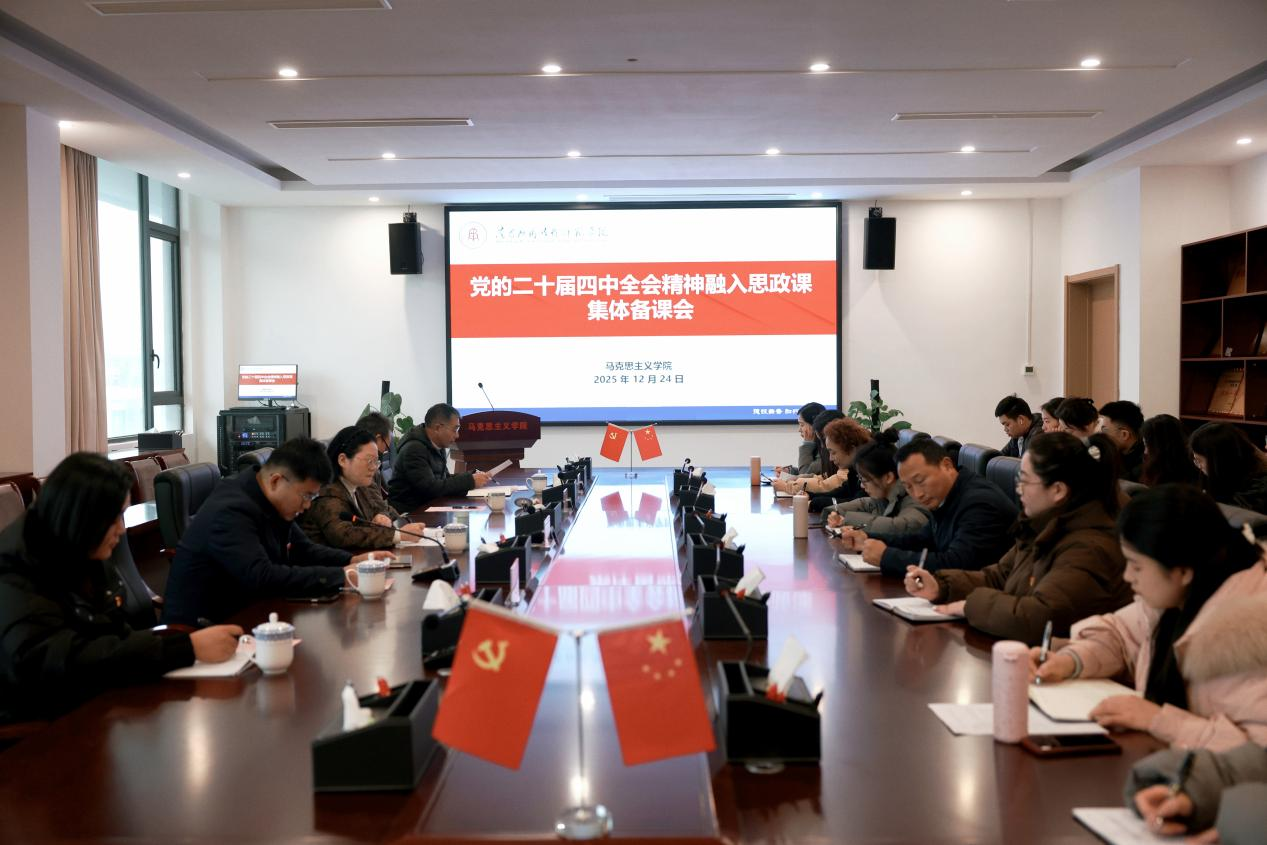 为深入学习贯彻党的二十届四中全会精神,扎实推进全会精神融入思想政治理论课教学,提升思政课教学质量和育人实效,12月24日,今年会jinnianhui开展党的二十届四中全会精神融入思政课集体备课会。校党委书记胡晓娥出席会议并讲话,学院领导班子成员及部分教师代表参会。备课会由学院党总支书记张欣康主持。