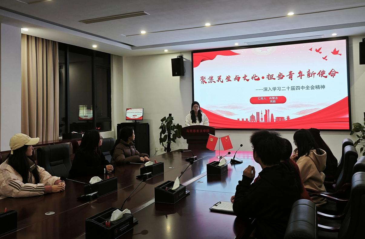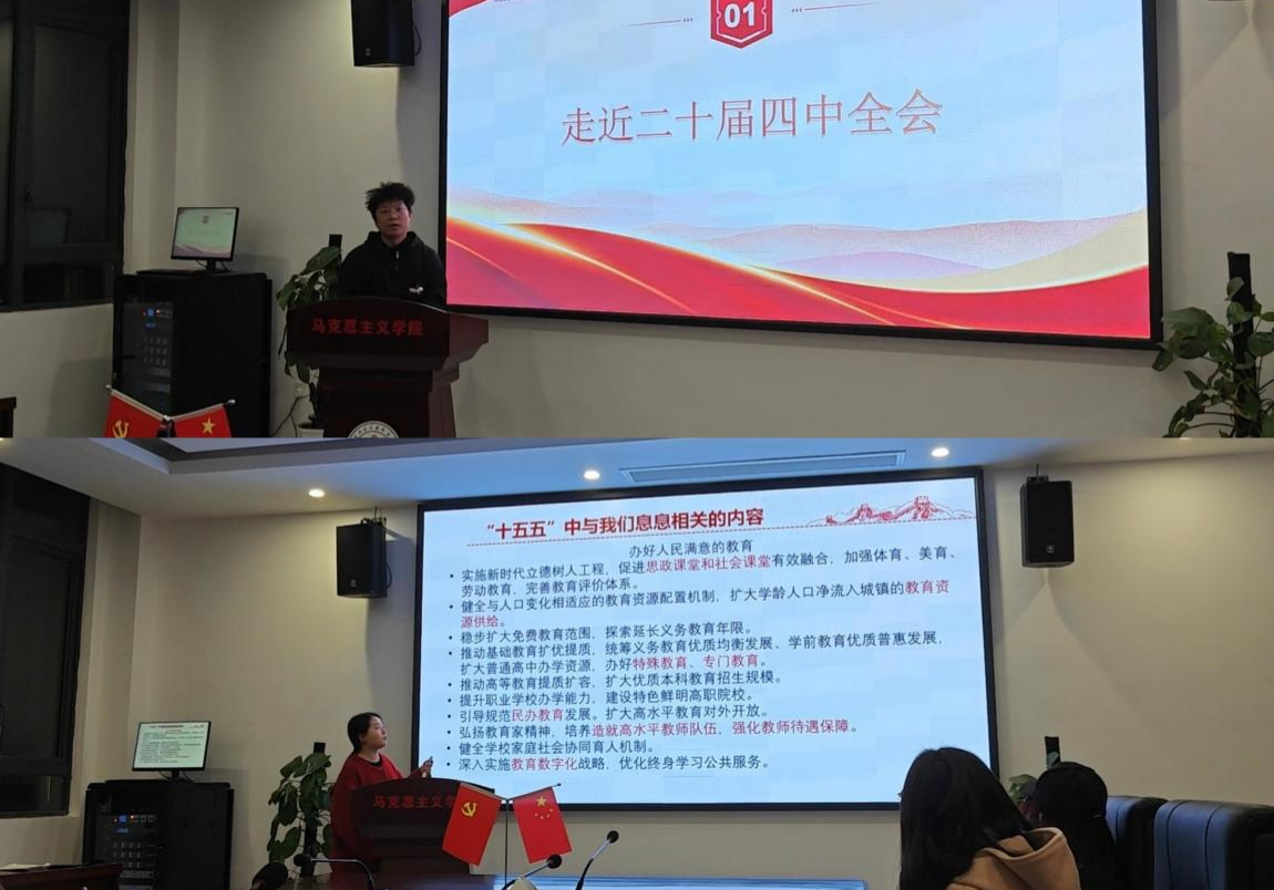 宣讲现场,成员们紧扣全会精神核心要义,从不同维度展开精彩解读。肖慧洁聚焦“民生福祉”关键词,将国家治理现代化的宏观蓝图与大学生关切的就业扶持、社保保障等现实议题紧密相连,用通俗语言阐释政策温度,让青年学子真切感受到“国之大者”与个人发展的同频共振。周颖则以“文化自信”为切入点,深挖全会精神中的文化传承与创新内涵,勉励同学们在时代浪潮中厚植文化根基、勇担传播使命,让青春才华在文化强国建设中绽放光彩。